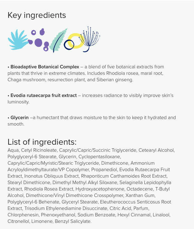 • Bioadaptive botanicals help increase your skin’s ability to adapt to its environment.
